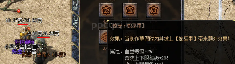 这个[傀皮·蛇巫甲]是法师,攻击上下限每级增加2%,血量和双防也是每级增加2%。