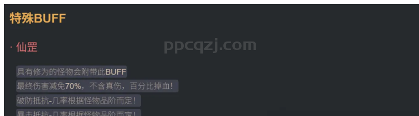 然后就是修仙大陆的怪物有仙罡这个词缀,最终伤害减免70%,还有破防抵抗和暴击抵抗,所以这就是大家会觉得怪物怎么这么难打,而且暴击的触发也没有之前的几率高的原因!这一切都不是错觉,资料站都是有介绍BUFF的,大家可以抽空看看。