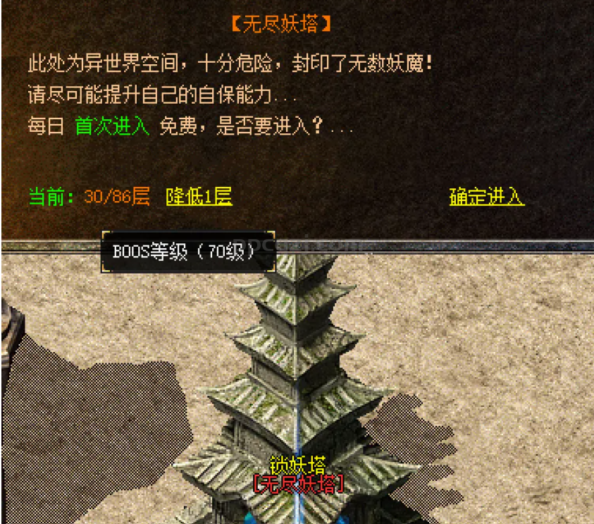 咱们用每天都要免费进一次的锁妖塔举例,自身等级如果达到90,那么应该是杀90级的怪了吧,但是这个锁妖塔的进入层数是根据自身等级来的,比如这里显示BOSS70级,但是这个时候如果我还带着新手那一套装备,说不定一层也打不了,进去也是浪费了一次宝贵的集中锤BOSS的机会!