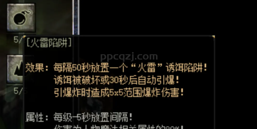 火雷陷阱:每隔50秒放置一个诱饵陷阱,诱饵被破坏或到了30秒自动引爆,可以在爆炸时造成5*5范围爆炸伤害!