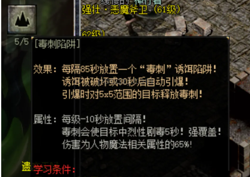毒刺陷阱就如名字所言,会放置一个毒刺的诱饵陷阱,也是引爆时对5*5范围的目标释放毒刺。