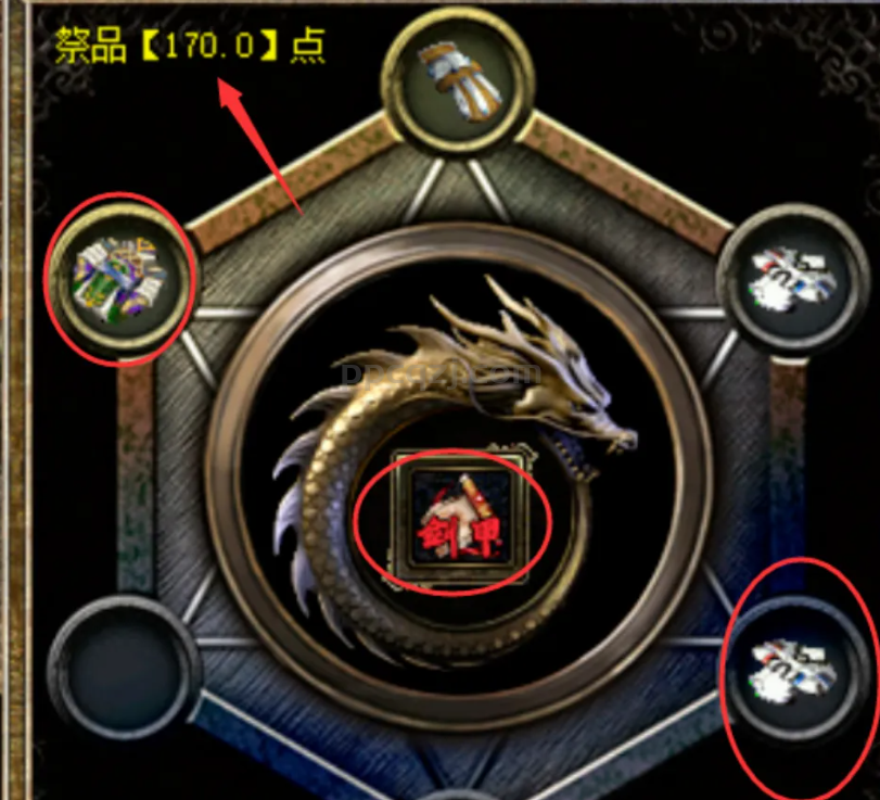 中间放图纸,旁边的位置就用来放装备的,大家不要去把什么提纯仙源放里面了哦,这里都是放的祭品,左上角可以看到祭品点,大家可以通过更换装备来提升祭品点。
