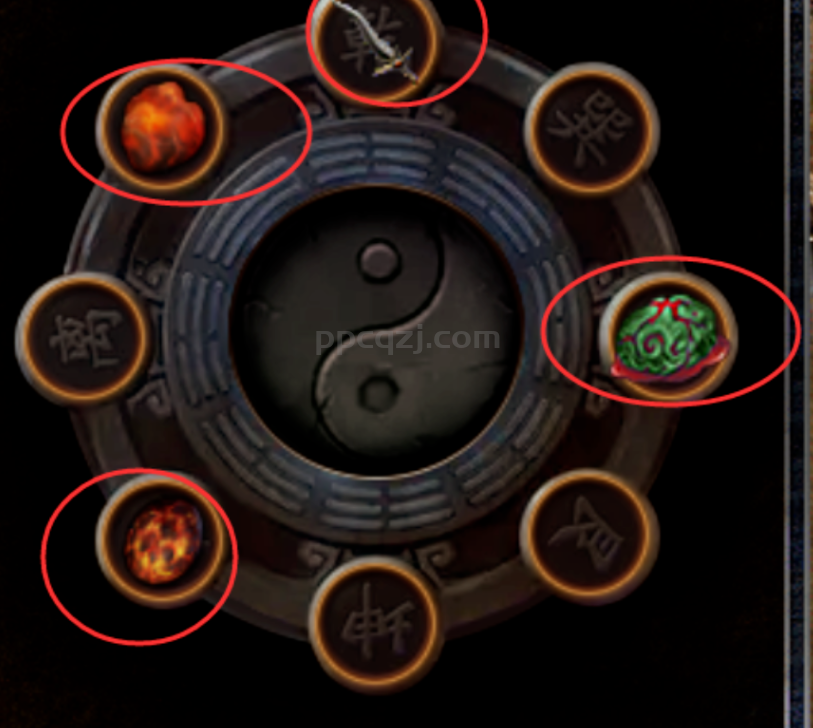 这个先天八卦币双击打开以后就是这样,那么要打造需要在不同的位置放入不同的道具,很多的新手玩家会随机的放一下,自己乱试,有经验一点的会根据名字猜一下,其实这里是有炼化提示的,所有的配方都是可以在资料站查到的哦!