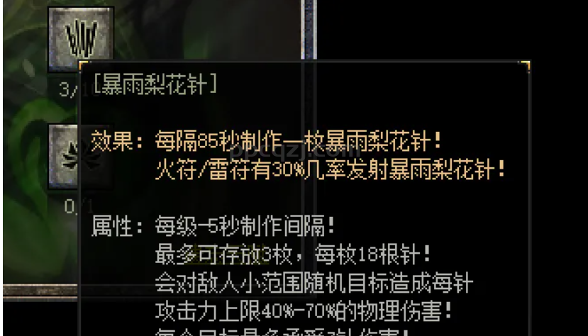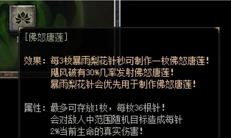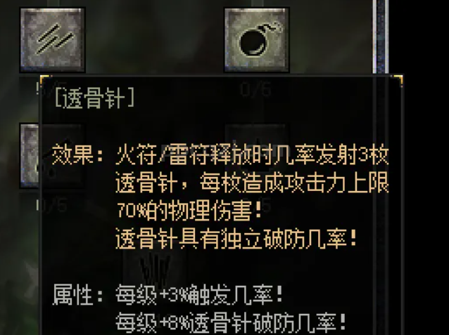 这个最多可以存放3枚,每枚18根针,会对敌人小范围随机目标造成每针攻击力上限40%—70%的物理伤害!