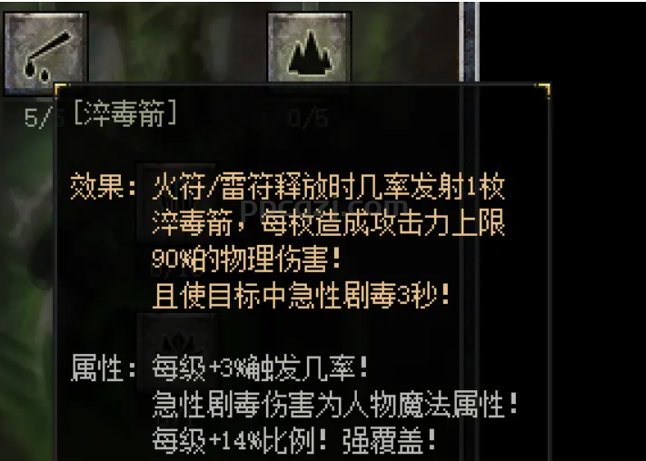这个是天赋是火符、雷符释放时几率发射1枚淬毒箭,每枚造成攻击力上限90%的物理伤害,但是急性剧毒的伤害是人物魔法属性哦,这还是需要注意一下。