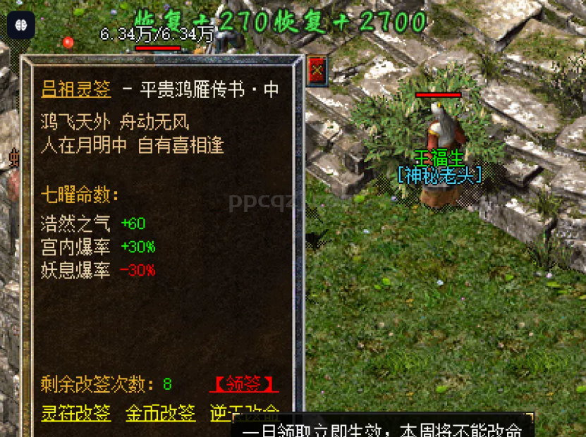 点了王福生老头就出现一个抽签的界面了,这里不管你是用金币也好,灵符也行尽量搞个上签再领取,或者有条件的直接开个逆天改命拿上上签都行,毕竟一个星期就能弄一次签,签文的好坏关系着你在真天宫的时长、妖息的获得,以及灵符的获得这些~