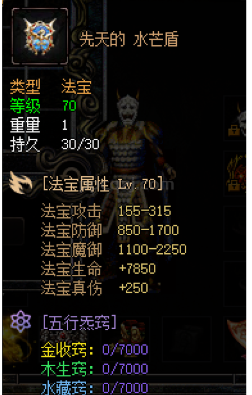 水属性法宝,附带特效【御魔盾灵】,受到非物理伤害时抵消法宝【40%, 50%, 60%, 80%, 100%】,魔御相关的伤害,冷却【120, 120, 120, 120, 90】秒