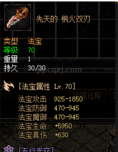 火属性法宝,附带特效【炎环击】,攻击时造成法宝攻击相关【10%, 20%, 30%, 50%, 70%】,的范围伤害!,冷却【90】秒