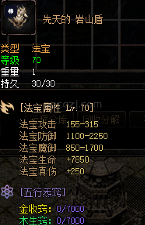 土属性法宝,附带特效【金刚盾灵】,受到物理伤害时抵消法宝【40%, 50%, 60%, 80%, 100%】,防御相关的的伤害!,冷却【120, 120, 120, 120, 90】秒