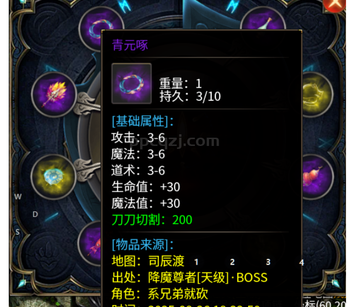 法器自2大陆开始,打怪能爆出所有法器,总共有8件法器,每件法器除了基础属性外,还有增加恰属性如切割、爆率增加、PK增伤减伤等。