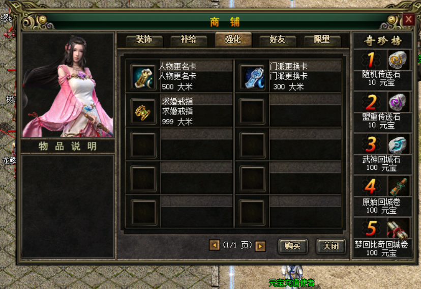 首先装饰栏卖的道具有四款分别为:修复、红名清洗、发型和瞬间回城