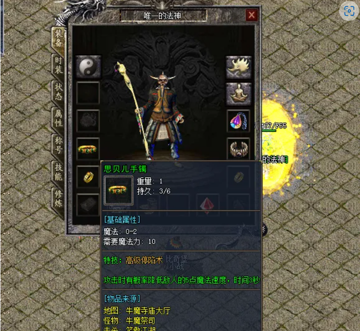 就比如说我手上的这个思贝儿手镯,自带魔法:0-2的基础属性,虽然属性比较一般,但自带的特技高级停陷术就很适合这种拥有群体伤害的法师。